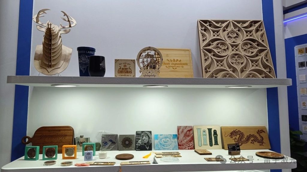 此外,雷宇激光还展示了各种激光切割雕刻的创意品,如精美的木质工艺品、个性化的皮革制品等,特别是激光工艺墙更是让参观者眼前一亮。