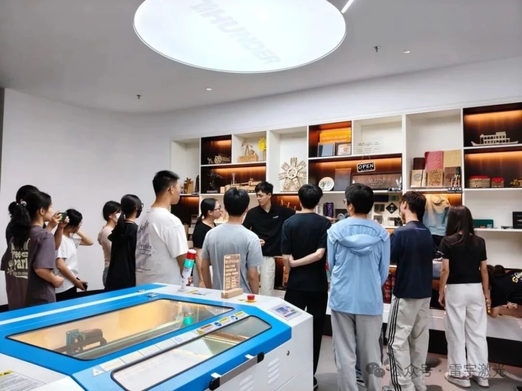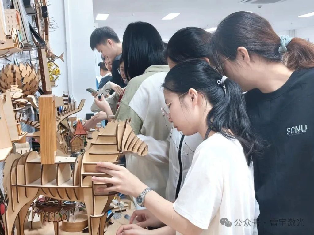 在雷宇教育技术人员的指导下,学生们来到实操区域,亲身体验激光切割机的操作??醋偶す馔肪嫉卦诓牧仙锨懈睢⒌窨?,同学们的创意逐渐变成实物,点燃了探索科技的热情。